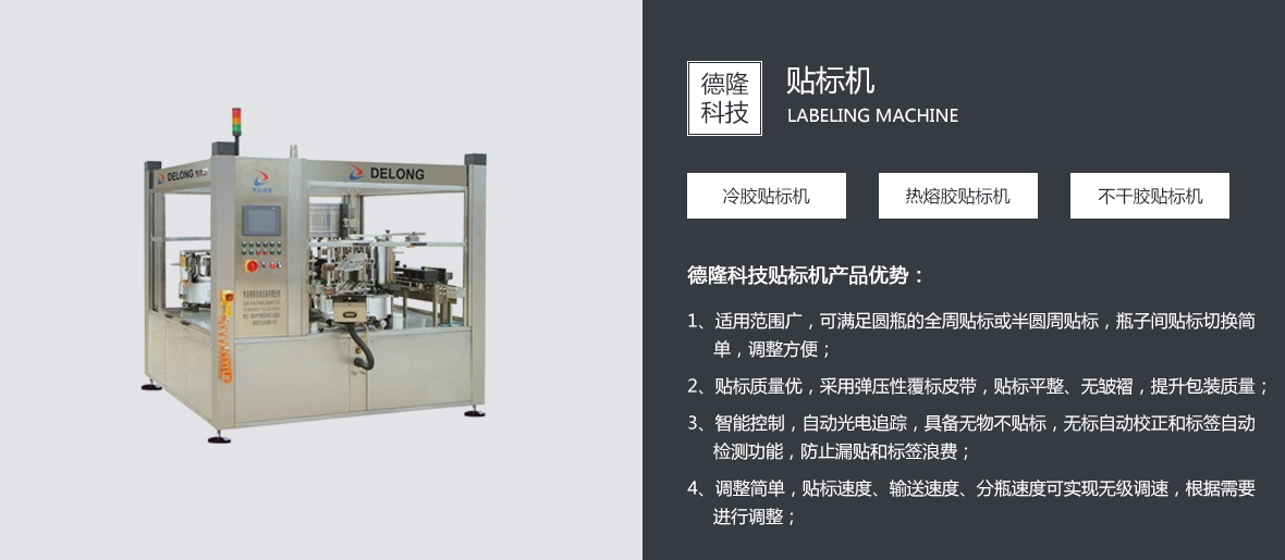 青島德隆自1995年創(chuàng)建以來(lái),始終秉承創(chuàng)新與發(fā)展的優(yōu)良傳統(tǒng),依靠技術(shù)與服務(wù)贏(yíng)得客戶(hù)的信賴(lài)與尊重。在貼標(biāo)機(jī)向?qū)W⒒?、多行業(yè)領(lǐng)域發(fā)展并成就了中國(guó)異型瓶貼標(biāo)市場(chǎng)的經(jīng)典之后,應(yīng)市場(chǎng)不斷變化的客戶(hù)需求,優(yōu)化產(chǎn)品結(jié)構(gòu),引進(jìn)吸收國(guó)內(nèi)外的流體包裝設(shè)備理念,在貼標(biāo)機(jī)專(zhuān)業(yè)化地位穩(wěn)固的前提下,逐步實(shí)現(xiàn)關(guān)聯(lián)產(chǎn)品的多元化。 目前,青島德隆已經(jīng)成為國(guó)內(nèi)能同時(shí)滿(mǎn)足圓瓶、方瓶、扁瓶、錐度瓶、球形瓶、定位瓶等瓶型的高、中、低速多功能冷(熱)膠貼標(biāo)領(lǐng)域的廠(chǎng)家。隨著碼/卸(瓶/罐)垛機(jī)、沖瓶機(jī)、灌裝擠(旋/壓)蓋機(jī)、全自動(dòng)紙箱包箱設(shè)備、排序機(jī)、機(jī)器人碼/卸垛設(shè)備、激光噴碼機(jī)的運(yùn)行成功,一個(gè)真正的流體包裝設(shè)備方案解決專(zhuān)家已經(jīng)成熟。 青島德隆集團(tuán)的···......
